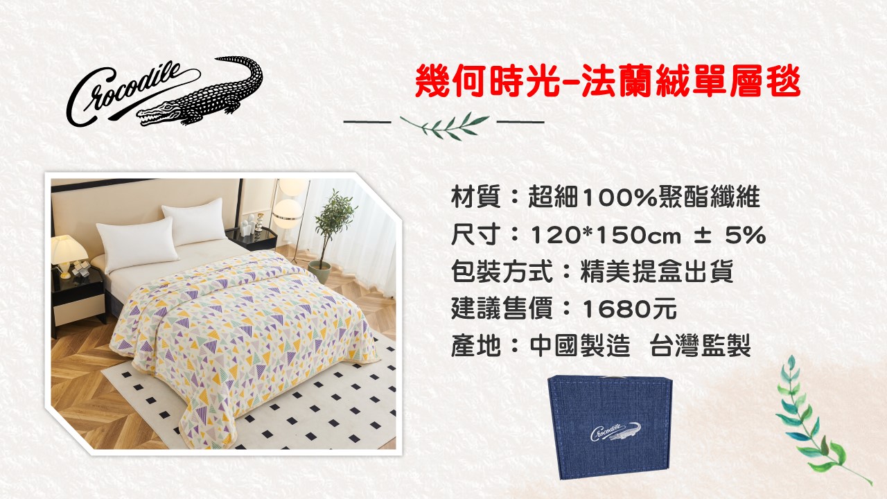 首頁 > 毯 被 類 > 毛毯 > Crocodile 幾何時光-法蘭絨單層毯(童毯) 毛毯 Crocodile 幾何時光-法蘭絨單層毯(童毯) NT$1680 NT$660 簡介 CR-S201/法蘭絨單層毯(童毯) 規格 120*150cm±5% 數量 -+ 加入購物車 直接結帳 詳細說明 ▎商品介紹 ▎運送方式 回上一頁