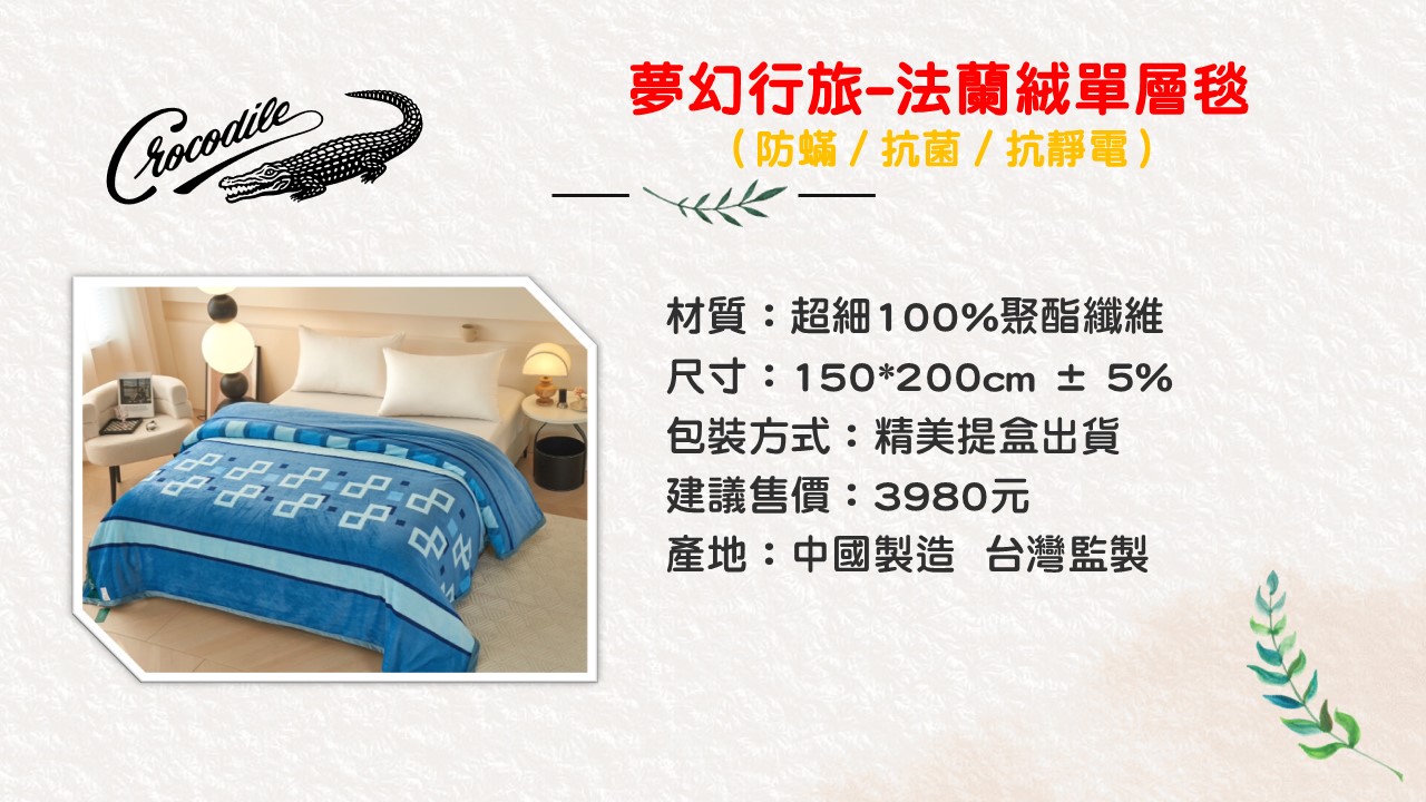 首頁 > 毯 被 類 > 毛毯 > Crocodile 夢幻行旅-法蘭絨單層毯 毛毯 Crocodile 夢幻行旅-法蘭絨單層毯 NT$3980 NT$1100 簡介 CR-22A/法蘭絨單層毯 規格 150*200cm±5% 數量 -+ 加入購物車 直接結帳 詳細說明 ▎商品介紹 ▎運送方式 回上一頁