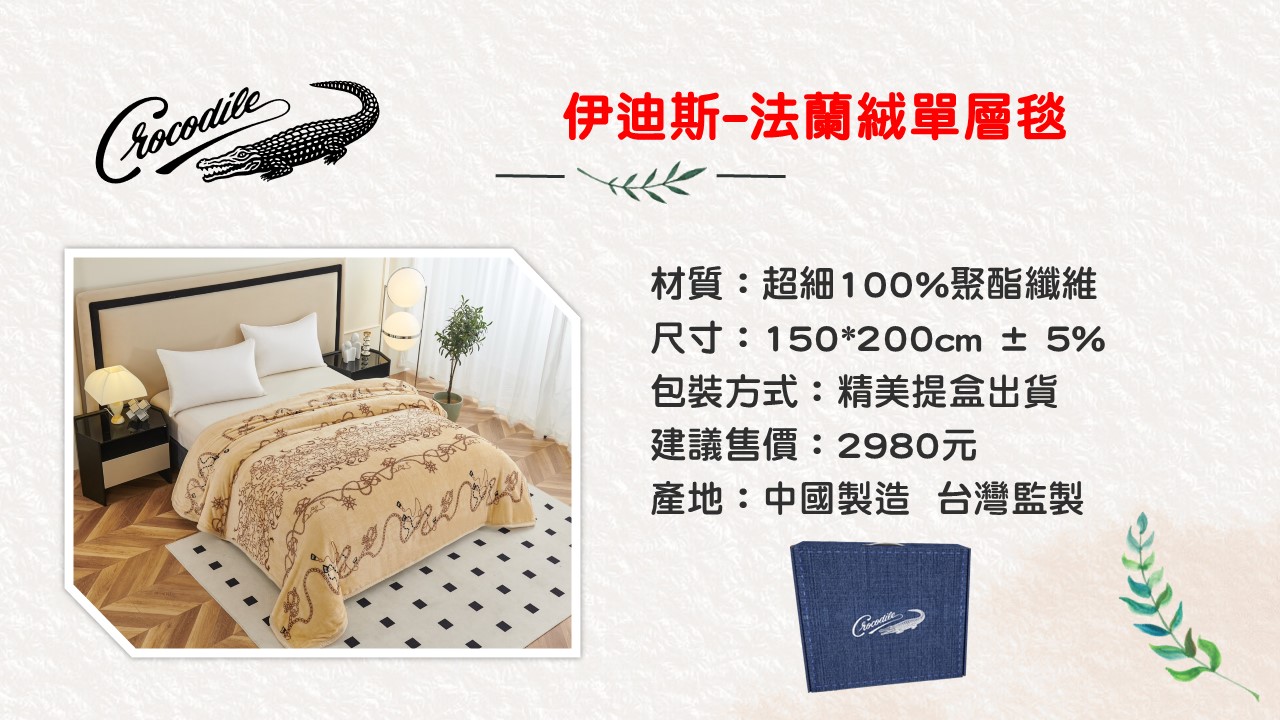 首頁 > 毯 被 類 > 毛毯 > Crocodile 伊迪斯-法蘭絨單層毯 毛毯 Crocodile 伊迪斯-法蘭絨單層毯 NT$3980 NT$1100 簡介 CR-2401/法蘭絨單層毯 規格 150*200cm±5% 數量 -+ 加入購物車 直接結帳 詳細說明 ▎商品介紹 ▎運送方式 回上一頁